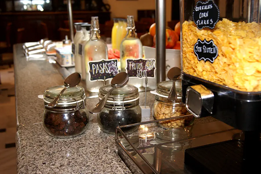 Además, para satisfacer todos los paladares, ofrecemos una irresistible selección de bollería, frutos secos y cereales. Si prefieres un desayuno más contundente, nuestro desayuno americano te espera con deliciosas opciones como tortilla, huevos y bacon.